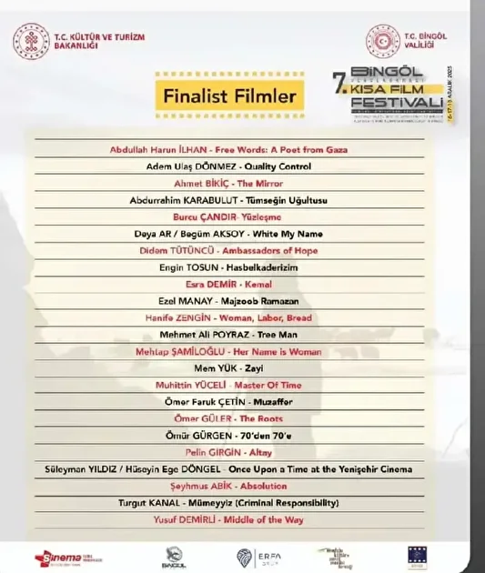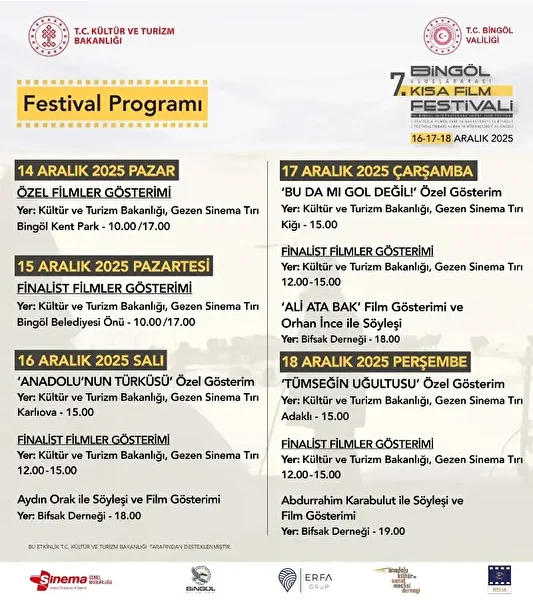 Kültür ve Turizm Bakanlığı himayesinde; Bingöl Valiliği ve Bingöl Belediyesi’nin katkılarıyla düzenlenen 7. Bingöl Uluslararası Kısa Film Festivali, 16–18 Aralık 2025 tarihleri arasında sinemaseverlerle buluşuyor. Festival kapsamında Türkiye’den ve dünyadan seçkin kısa filmler, özel gösterimler ve söyleşilerle izleyiciyle buluşturulacak.
