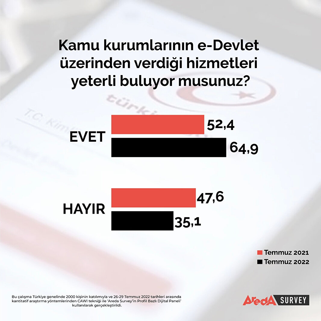 Areda Survey, kamu kurumlarının dijitalleşme sürecinde sunduğu hizmetlerin Türk halkına yeterli olup olmadığıyla ilgili bir araştırma yaptı. Şirketin Temmuz ayı Sosyometre araştırmasında kamu kurumlarının sunduğu dijital uygulamalarının yeterli olup olmadığına dair soruya katılımcıların yüzde 64,9’u yeterli cevabını verdi.