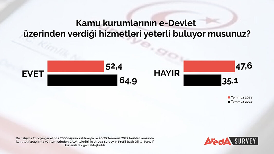 Areda Survey’in katılımcılara yönelttiği “Kamu kurumlarının e-Devlet üzerinden verdiği hizmetleri yeterli buluyor musunuz?” sorusuna katılımcıların yüzde 64,9’u yeterli, yüzde 35,1’i yetersiz cevabını verdi. Aynı araştırmanın 2021 yılına ait sonuçlarına bakıldığında katılımcıların yüzde 52,4’ü yeterli, yüzde 47,6’sı yetersiz bulduğu cevabını vermişti. Son iki yıla ait veriler değerlendirildiğinde e-Devlet üzerinden kamu kurumlarının sunduğu hizmetlerin yeterlilik düzeyinde yüzde 12’lik bir artış olduğu görüldü.