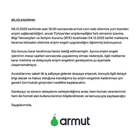 Online hizmet platformu Armut.com, mahkeme kararıyla erişime kapatıldı. Platform üzerinden temizlik, nakliye, tamirat ve tadilat gibi hizmetler için müşteriler ile hizmet verenleri buluşturan Armut.com’un web sitesi ve mobil uygulamasına erişim sağlanamıyor.