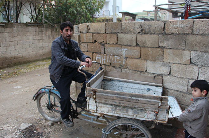 "İki oğlum Bünyamin ve Yusuf zihinsel engelli ve kalpleri delik dünyaya geldi. Birini ameliyat ettirebildim. Üç tekerlekli bisiklet ile yük taşıyarak para kazanıyorum. Kirada oturuyoruz. Aylık 400 lira kira ödüyorum. Çocuğumun engelli maaşı var, 3 ayda bir 400 lira. Bu parayı da kiraya veriyorum. Nusaybin Sosyal Yardımlaşma 3 ayda bir 100 lira veriyor. Başka da yardım alamıyorum. Çoğu zaman evde yiyecek olmadığı için, yemek fabrikalarından ve taziye evlerinden artan yemekleri toplayıp çocuklarıma getiriyorum. Isınmak için yakacak odunum yoktu. Bir vatandaş tahtalardan yapılmış tabutları getirdi. Kırıp, tahtalarını sobada yakıyoruz. Hayırseverlerden yardım bekliyorum."