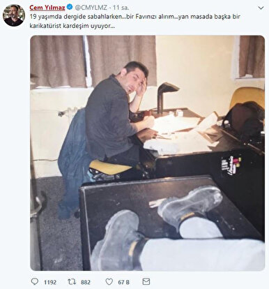 Yılmaz, paylaşımının altına ‘19 yaşımda dergide sabahlarken... Bir favınızı alırım... Yan masada başka bir karikatürist kardeşim uyuyor...’ notunu düştü.