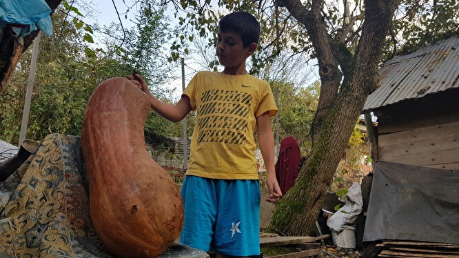 Hasat vaktine yakın zamanda bahçesini gezen Bostancı, neredeyse çocuk boyunda ve kilosunda olan kabağı görünce şaşırdı. Çiftçinin yeğeni, 70 santimetre boyundaki 22 kiloluk kabağı taşımakta zorlandı.