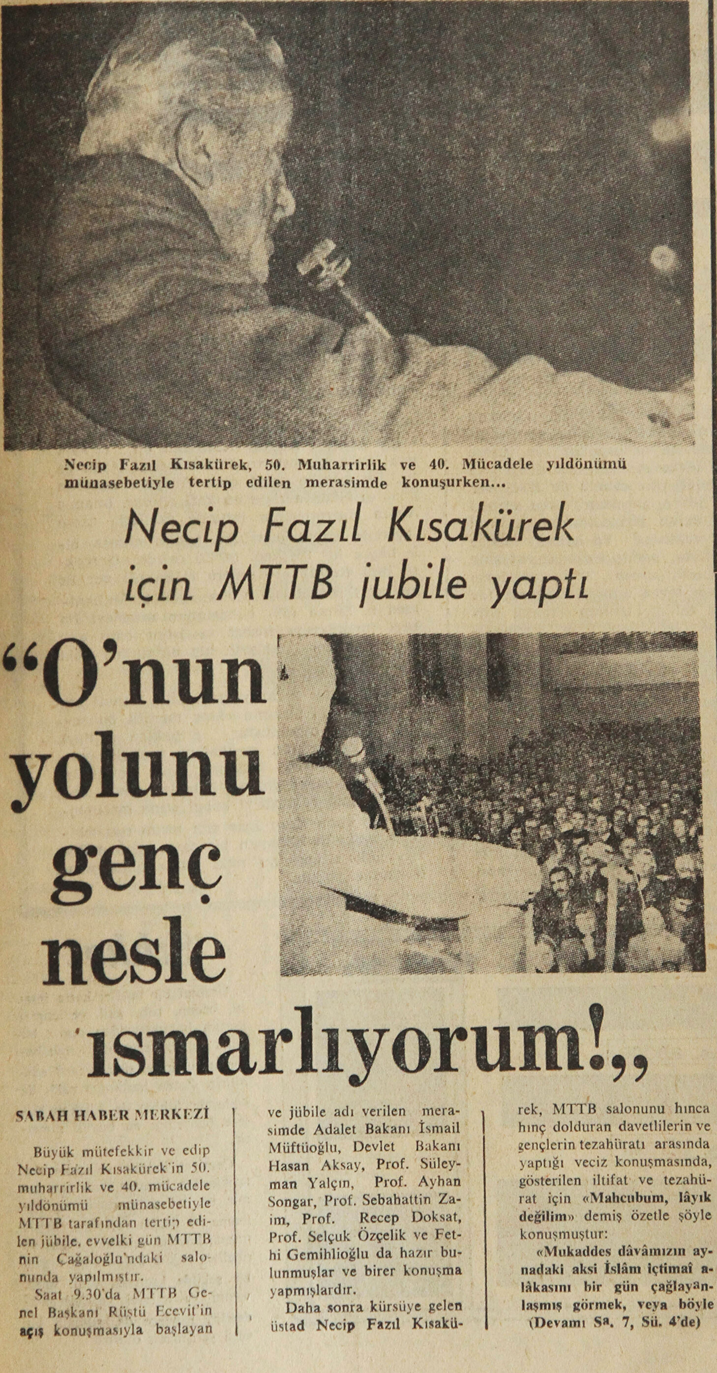 Bu seçkin jübile törenlerinden biri de “Fikir ve Şiir Hayatının 50. Yıl Dönümü”nde, Millî Türk Talebe Birliği’nce 23 Kasım 1975 Pazar günü Necip Fâzıl için düzenlenecektir. Aynı zamanda Necip Fâzıl’ın siyasî mücadelesinin 40. Yılı dolayısıyla da hazırlanan jübile MTBB’nin Cağaloğlu’ndaki merkezinde yapılır.