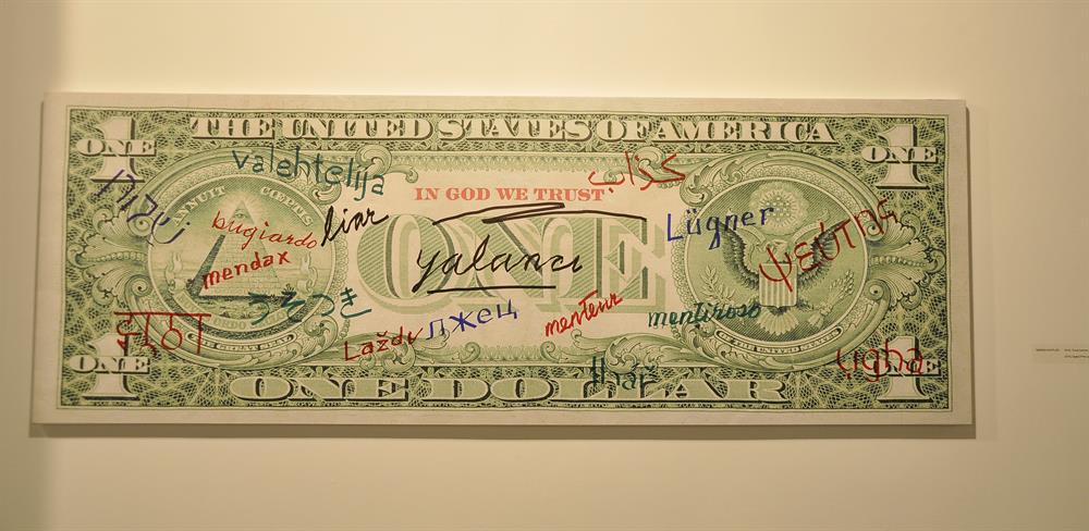 Dolar zalimlerin elinde atom bombasından çok daha tesirli, insanları ya açlıktan yahut da silahla öldüren bir alet. Herkes ona bayılıyor tabi. Üstelik de namussuzlar üstüne 'In God we trust' yazıyor. Biz Allah'a inanırız. Zaten her namussuz öldürdüğü zaman 'Biz Allah'ın tarafındanız' diyor ya. Ama bu herifler paralarının üstüne yazmış bunu. Biz de onu mahsus kırmızı ile yazdırdık. Üstünü çizip altına yalancı yazdık. Fethullah hoca hadisesinde doların kullanıldığını sonradan öğrendim. Herkes ' ne akıllı adamsın sen' diyor. Benim hiç haberim yoktu o işi hazırlarken. Görüyorsun ne kadar zalim varsa bunu kullanıyorlar. En hoşuma giden o oldu sergide. Üzerindeki de hakiki kan. 'Bulamayız' dediler. 'Bulmazsanız olmaz, Boya dökersek biz de yalancı oluruz.' dedim. Her gün onun üstüne yeni kan ilave edecekler. Suriyeli bir sanatçı dostumuz da doların üzerine Arapça Allah kahretsin yazdı.