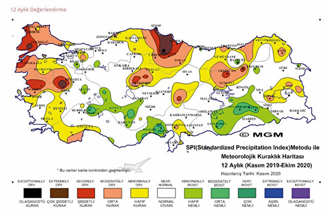 - Türkiye’degeçen aylar ve özellikle son dönemlerde baraj göllerinden yansıyan korkutucu fotoğraflar kuraklık konusunu gündemin üst sıralarına taşıdı.Meteoroloji Genel Müdürlüğü tarafından hazırlanan Ağustos-Ekim 2020 dönemine ilişkin meteorolojik kuraklık haritalarında yaşanan sıkıntının boyutu net bir şekilde fark edilebiliyor.Uzun yıllar kasım ayı yağış ortalaması 67,8 milimetre olan Türkiye'de, geçen ayki yakış miktarı 34,7 milimetrede kaldı.