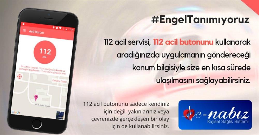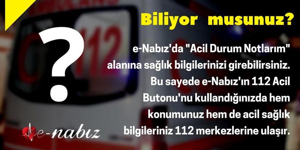 Sistemin mobil uygulamasının sunduğu en önemli hizmetlerden bir tanesi de 112 Acil butonu. Vatandaşlar, e-Nabız sisteminin mobil uygulamasında bulunan 112 acil butonunu kullanarak acil müdahale gerektiren durumlarda 112 acil servisini haberdar edebiliyor ve uygulamanın göndereceği konum bilgisiyle en kısa sürede bölgeye ulaşılmasını sağlayabiliyor. 112 acil butonunu sadece kendiniz için değil, yakınlarınız veya çevrenizde gerçekleşen bir olay için de kullanabiliyorsunuz. Yakın zamanda işitme engelli vatandaşlar da 112 acil butonunu kullanarak kendilerine ambulans gönderilmesini sağlayabilecekler.