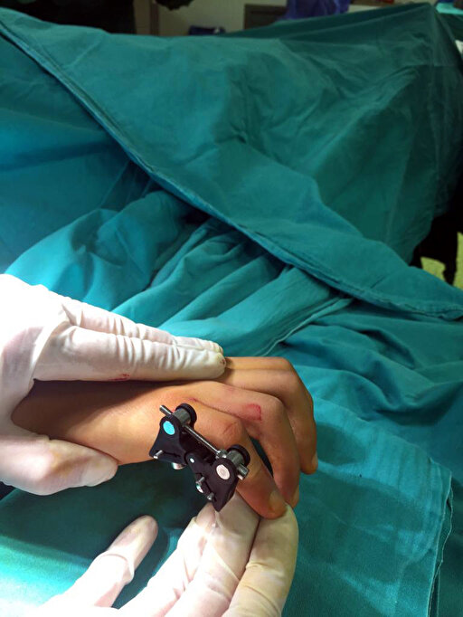 Parmak kontraktürü açma cihazı öncesinde hastaya lokal anestezi uygulandığını ifade eden Deveci, "Açık cerrahi ameliyatlarında anesteziye ait komplikasyonlar, enfeksiyon, yara yeri problemleri ve cilt dokusu yetmediği durumlarda başka yerden deri yaması alınması ihtiyacı olabilmektedir. Bizim sistemimizde ise tamamen lokal anestezi yapılmakta. Operasyon 5-10 dakika sürmektedir. Sadece çivilerin girdiği yerlerde bir cerrahi işlemimiz oluyor" diye konuştu.