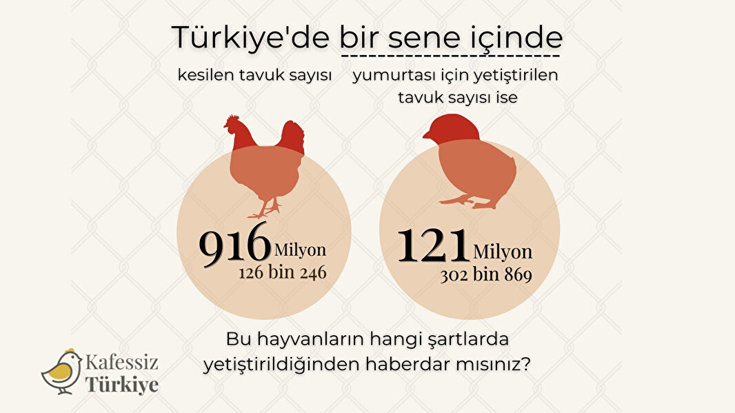 Yumurta üretimi için kullanılan tavukların verimliliğini attırmak için uygulanan kafes sistemi hayvanlar için eziyete dönüşüyor. Kafessiz Türkiye kampanyası ile bir tavuğa kanatlarını dahi açamayacağı kadar küçük A4 kâğıdı boyutunda alana zorunlu kılınan sistemin yasaklanması isteniyor. Kafessiz Türkiye kampanyası, kafes sistemini 'Olağanüstü sayıda hayvanın böyle ağır bir eziyeti çekmesi felaket.' olduğunu ifade ediyor.