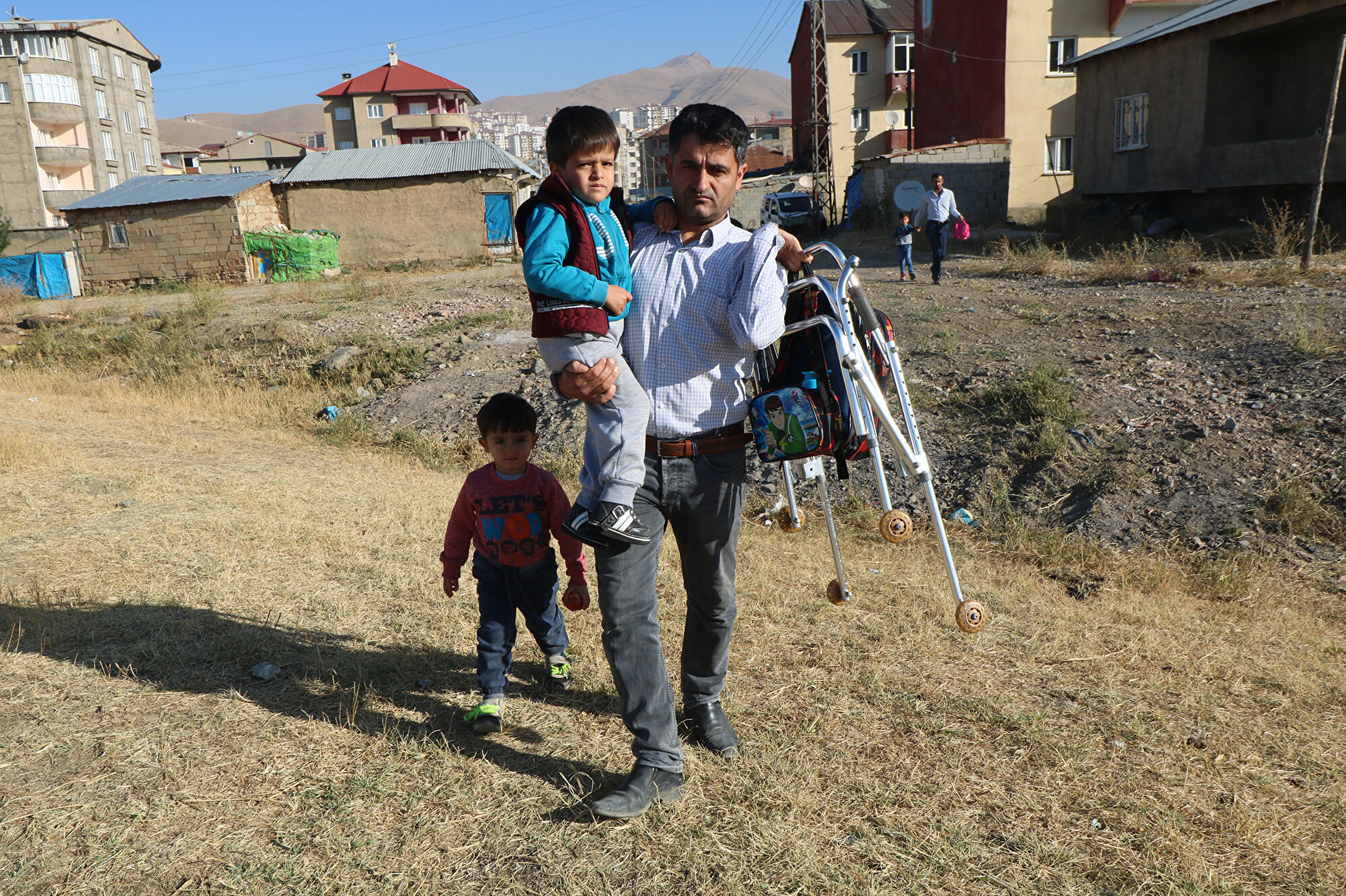 Dağlar, yüzde 80 ortopedik engelli olan oğlunu kucağında ya da sırtında okula götürüp, geri getiriyor. Gidiş geliş her gün 2 kilometre yol yürüdüklerini belirten Mahkum Dağlar, oğlunun ayakta durmasını ve küçük adımlar atmasını sağlayan yürütecini de beraberinde taşıyor.