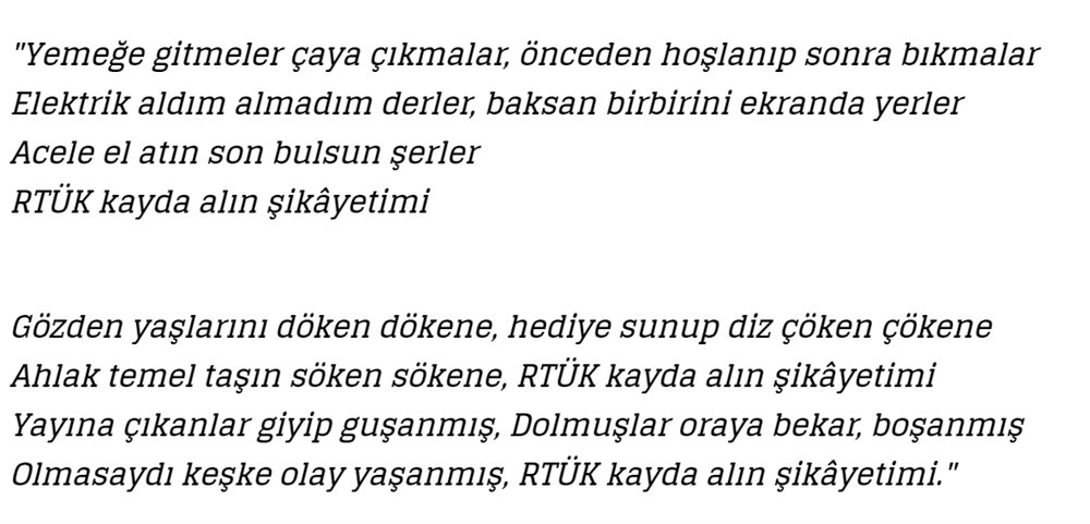 Raporda şikayet örnekleri de yer alırken, BİMER'e gelen "RTÜK kayda alın şikayetimi" başlıklı şiir çok dikkat çekti. Şiirden bazı dizeler: