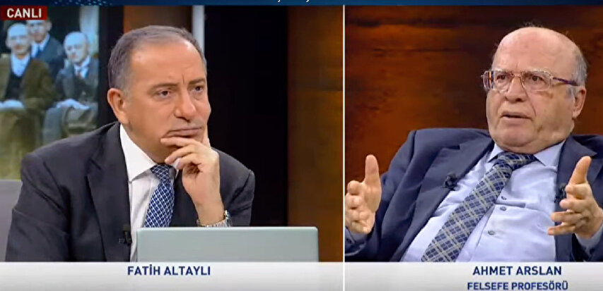 Fatih Altaylı’nın Habertürk'teki Teke Tek Bilim programına katılan Felsefe Profesörü Ahmet Arslan, din ve felsefe ilişkisini yorumlarken Allah’ın ayetleri ile dalga geçti.