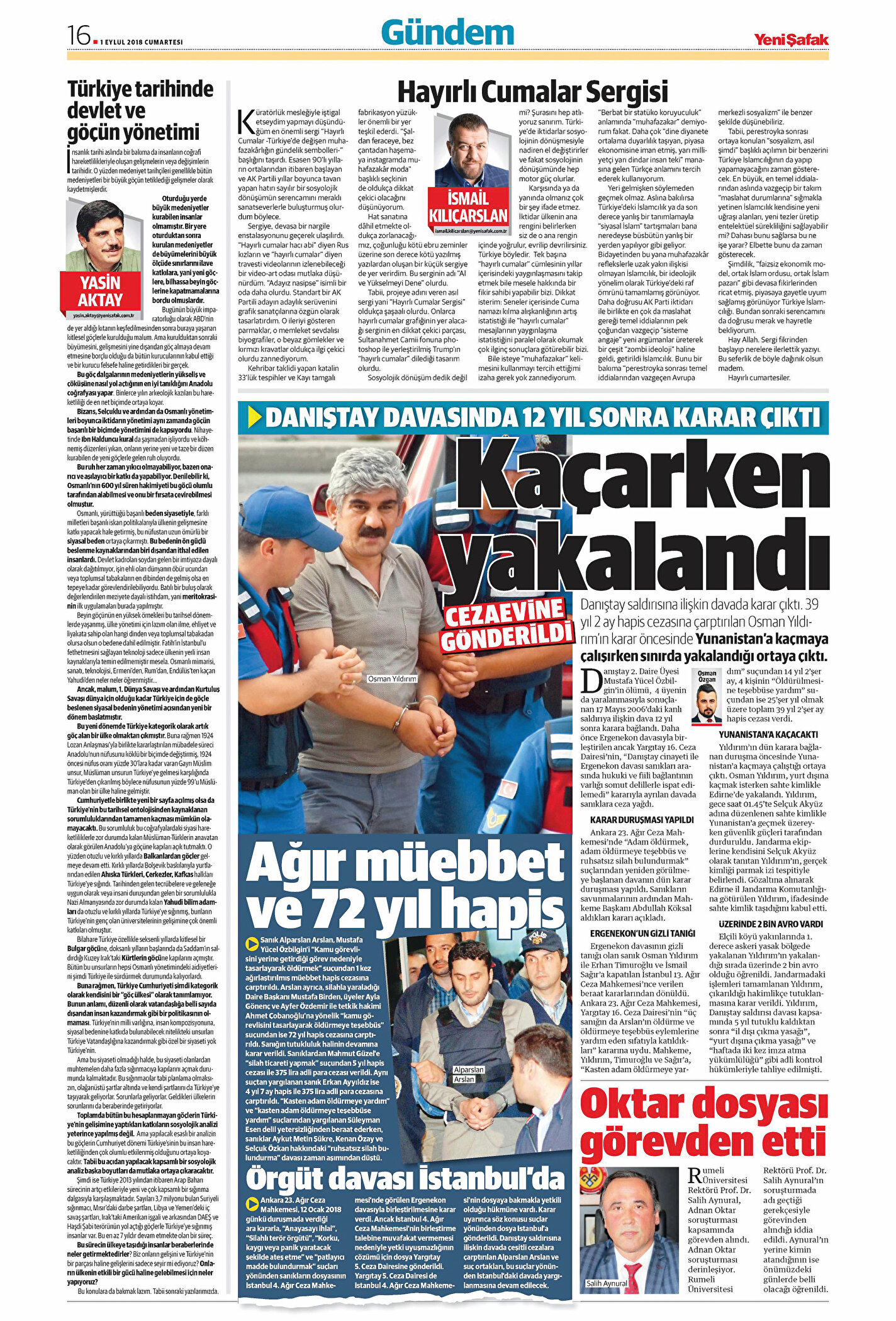 Hukukun kalbi Danıştay, 17 Mayıs 2006 tarihinde kana bulandı. İstanbul Barosu’na avukat olarak kayıtlı Alparslan Arslan, toplantı halindeki Danıştay 2. Daire Üyesi Mustafa Yücel Özbilgin’i öldürdü ve beraberindeki 4 danıştay üyesini yaraladı. Yeni Şafak, attığı manşetlerle karanlık güçlerin tetikçisi bir avukatın işlediği bu cinayetin arkasındaki gerçeklerin ortaya çıkarılmasını istedi. Danıştay davası, 18 Mayıs 2009 tarihinde Ergenekon davası ile birleştirildi. Danıştayın “başörtüsü kararı” öne sürülerek işlenen kanlı komplonun arkasından FETÖ çıktı. Alparslan Arslan, 2018 yılında ağırlaştırılmış müebbet ile 72 yıl hapse mahkum edildi.