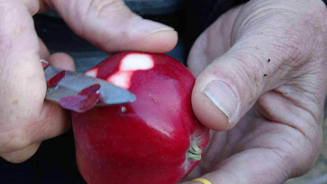 "İçi dışı kırmızı elmanın olgunlaşması için bekleyip emeğimizin karşılığını almak istiyoruz. Ama iklim değişikliği emeklerimizin karşılığını almamıza olumsuz etki ediyor. Son 2 hafta içinde gerekli nem ve kırağı oluşursa elmamızın içi de dışı gibi istenilen kırmızılık olacak. Bu elma genel manada iklim şartlarına göre değişkenlik gösterebiliyor. İklim şartları uygunluğuna göre elmanın içi tam kırmızılaşıyor. Ama iklim şartları olumsuz gittiğinde elma beyaz kalıyor, ya da çok az kırmızılaşıyor"