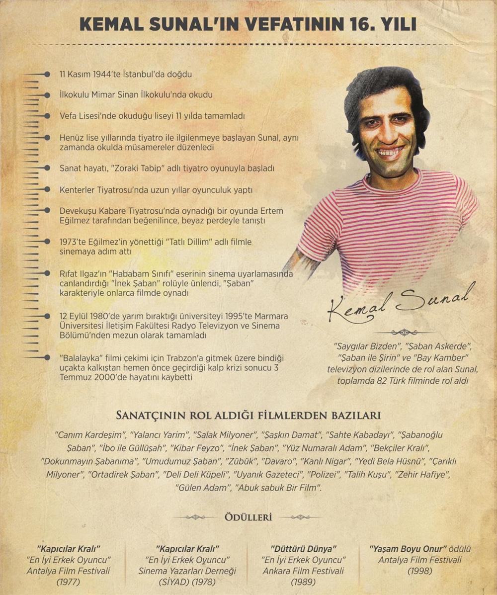 Yarın, Türk sinemasının duayen isimlerinden Kemal Sunal'ın vefatının 16. yıl dönümü. 3 Temmuz 2000'de hayatını kaybeden sanatçı, beyaz perdede geçen yılları boyunca 80'den fazla filmde rol aldı. Canlandırdığı karakterlerle büyük beğeni toplayan Sunal'ın filmleri halen televizyon kanallarında sık sık gösteriliyor.
