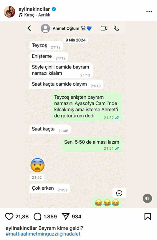 Kadıköy'de uğradığı bıçaklı saldırı sonucu hayatını kaybeden Mattia Ahmet Minguzzi'nin teyzesi Aylin Akıncılar, sosyal medyada yeğeni ile geçen yıl bayram namazı ile ilgili yaptığı konuşmanın ekran fotoğrafını "Bayram kime geldi" notuyla paylaştı.