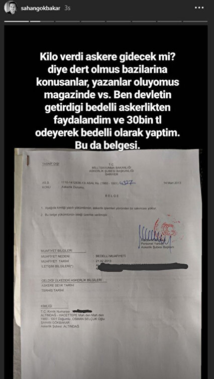 Şahan Gökbakar, “askere gidecek mi?” sorularına sosyal medya hesabından yayınladığı belgeyle karşılık verdi. Gökbakar, paylaşımında şu ifadeleri kullandı: