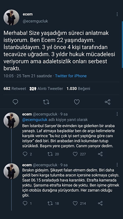 Ecem Güçlük, yaptığı paylaşımda 22 yaşında olduğunu, İstanbul Sarıyer'de 3 yıl önce 4 kişi tarafından tecavüze uğradığını, 3 yıldır hukuk mücadelesi verdiğini ancak şahısların serbest bırakıldığını öne sürdü ve iddia ettiği süreci anlattı.
