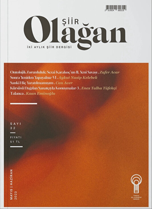 İki ayda bir yayımlanan Olağan Şiir, şiir metinlerine, şiir üzerine inceleme, araştırma ve eleştiri yazılarına yer veriyor. 32. sayıya ulaşan dergide ayrıca tahlil yazıları ve dosyalar da yer alıyor. Türkiye Dil ve Edebiyat Derneği'nce yayımlanan dergiyi Aykut Nasip Kelebek yönetiyor. Sunuş'ta yeni kuşağın dergisi olduklarını vurgulayan Kelebek,“Açık, ne söylediği belli olan, okuyucuya sırtını dönmeyi değil onunla iletişim kurmayı seçen bir şiir anlayışını teklif ediyoruz” diyor. Sade kapak tercih edilmiş. Zafer Acar, Aykut Nasip Kelebek, Can Acer, Enes Talha Tüfekçi ve Kaan Eminoğlu isimleri kapağa çıkarılmış. Derginin içindekiler bölümü var fakat bu bölümü arka kapakta da görüyoruz. Olağan Şiir'e 'olağan' olarak şiirlerle başlıyoruz. (20 şiir). Mahsum Oğrak, Kaan Eminoğlu, Mehmet Baş ve Murat C.'nin şiirlerini tavsiye ediyorum. Bu sayının yazarları da, uzun Sezai Karakoç yazısına imza atan Zafer Acar ve Bayram Zıvalı yazısıyla Mert Mevlüt Gökçe. Dergi, Türk Telekom E-Dergi’den ücretsiz okunabiliyor fakat siz yine de satınalın. Olağan Şiir'e, 0 212 581 69 12 no'lu telefondan ulaşılabilir.