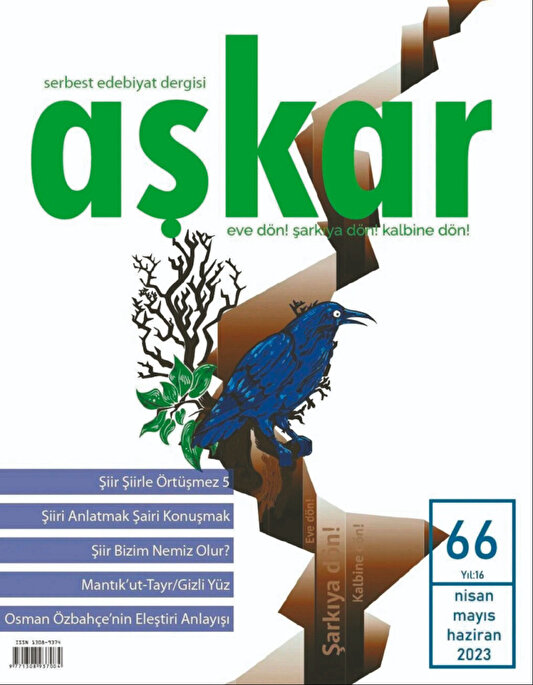Serbest edebiyat dergisi Aşkar, “eve dön! şarkıya dön! kalbine dön!” alt başlığıyla çıkıyor. Şiir, Öykü, Söyleşi, Poligon, Taarruzname, Mesuliyet Meselesi ve Kitap olmak üzere yedi bölümü bulunan derginin yayın yönetmeni Mustafa Melih Erdoğan. 66. sayının girişinde başlıksız bir takdim var. Konu zelzele. “Vatanını seven işini iyi yapsın” düsturunun öne çıktığı takdim, şöyle bitiyor: Üzüntünüzü paylaşmıyoruz, üzüntünün ta kendisiyiz.(...) Bu sayıda yeralan ve Özgür Ballı'nın şiiriyle başlayan 20 çalışma arasında Aziz Mahmut Öncel, Çağrı Subaşı, Zeynep Özgür Can ve Taha Tayyib Karaaslan'ın şiirlerini kendime yakın buldum. İbrahim Akbulut'un şiirinin başlığıysa tek başına şiir: Hiç, Çoktan Çoktur!.