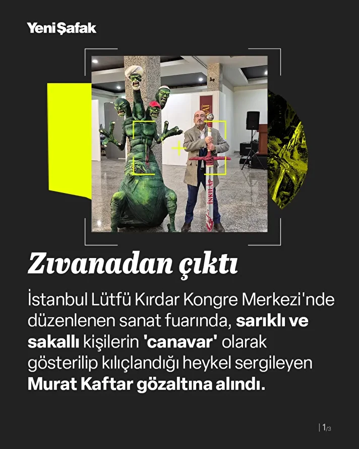 İYİ Parti Kayseri teşkilatında görevli Murat Kaftar, Müslümanları hedef almaya devam ediyor. Sanat fuarında sergilediği figüründe sarıklı ve sakallı kişileri canavar olarak tasvir eden Kaftar gözaltına alındı.