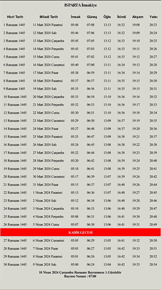 Isparta Ramazan imsakiyesi 2024 namaz vakitleri, sahur, iftar, akşam ezan saati