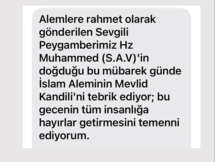 - Mevlid Kandiliniz kutlu olsun. Hz. Muhammed'in doğumunun tüm insanlığa hayırlara vesile olmasını dilerim.