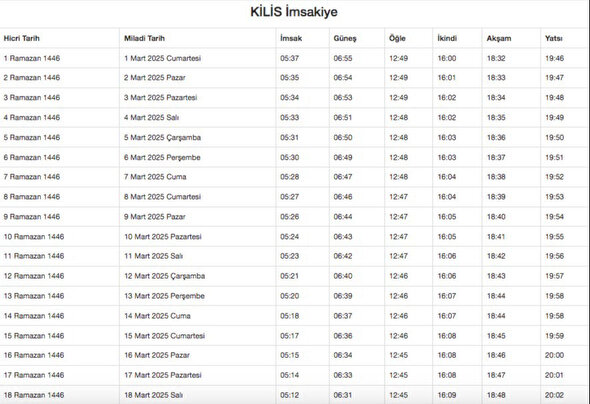 Kilis Ramazan imsakiyesi 2025 imsak, sahur, iftar, akşam ezan saatleri