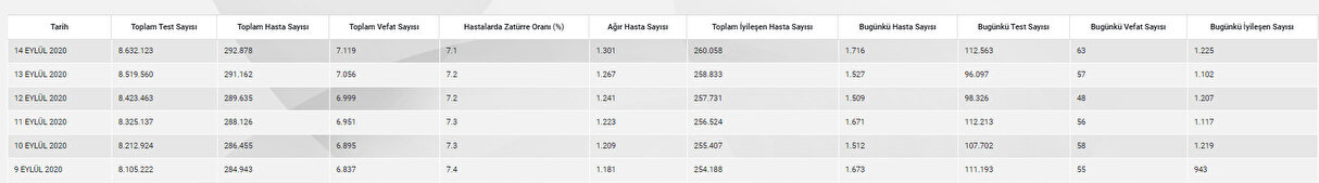 Sağlık Bakanlığının Koronavirüs Bilgilendirme Sayfası'nda yer alan veriler yenilendi. 14 Eylül koronavirüs sonuçlarının yer aldığı tabloda son durum oldukça endişe verici.