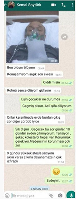 - Mesajında 9 gündür hastanede tedavi gördüğünü söyleyen Kemal Soytürk'ün,"Ben öldüm, ölüyorum. Konuşamıyorum artık son evresi. 9 gündür yüksek ateşle yatıyorum. Aklın varsa çıkma. Dayanamazsın çok ıstıraplı"dediği görüldü.