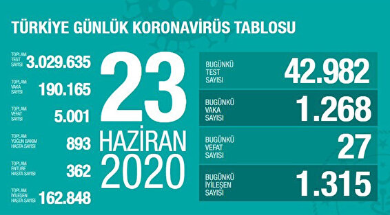 Sağlık Bakanlığının internet sitesinde yer alan ve Bakan Fahrettin Koca'nın Twitter'dan paylaştığı "Türkiye Günlük Koronavirüs Tablosu"nun güncel verilerine göre, bugün 48 bin 309 test yapıldı, 1356 kişiye Kovid-19 tanısı konuldu. Son 24 saatte 15 hasta vefat etti, 1413 kişi iyileşti.
