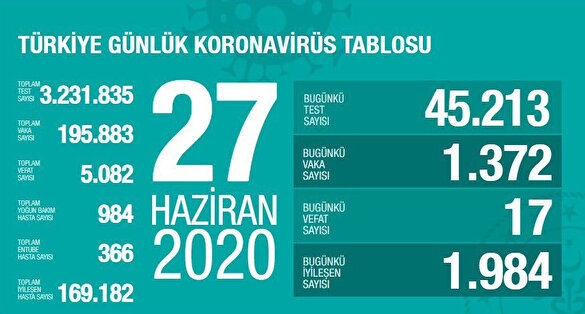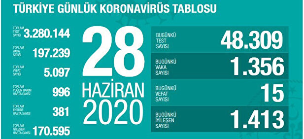 Sağlık Bakanı Fahrettin Koca, 28 Haziran günü itibari ile son 24 saatte gerçekleşen koronavirüsle ilgili ölüm ve toplam vaka sayısını açıkladı. Bakan Koca, verileri Sağlık Bakanlığı Korona Tablosunun görseliyle duyurdu. Bugün 1356 kişiye yeni tip koronavirüs (Kovid-19) tanısı konuldu, 15 kişi hayatını kaybetti, toplam vaka sayısı 197 bin 239, can kaybı 5 bin 97 oldu.