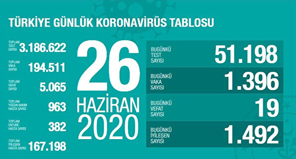 - Bakan Koca, Twitter hesabından son verilere ilişkin yaptığı paylaşımda,"Yeni tanı konan kişi sayısında düne kıyasla 16, bir önceki güne kıyasla 40 azalma var. Bugün iyileşen toplam vaka sayımız, dünkünden 571 kişi düşük. Vaka sayılarını azaltmada yeterince hızlı, mücadelede tam tedbirli değiliz. Yaz, rehavete neden olmamalı."ifadelerini kullandı.
