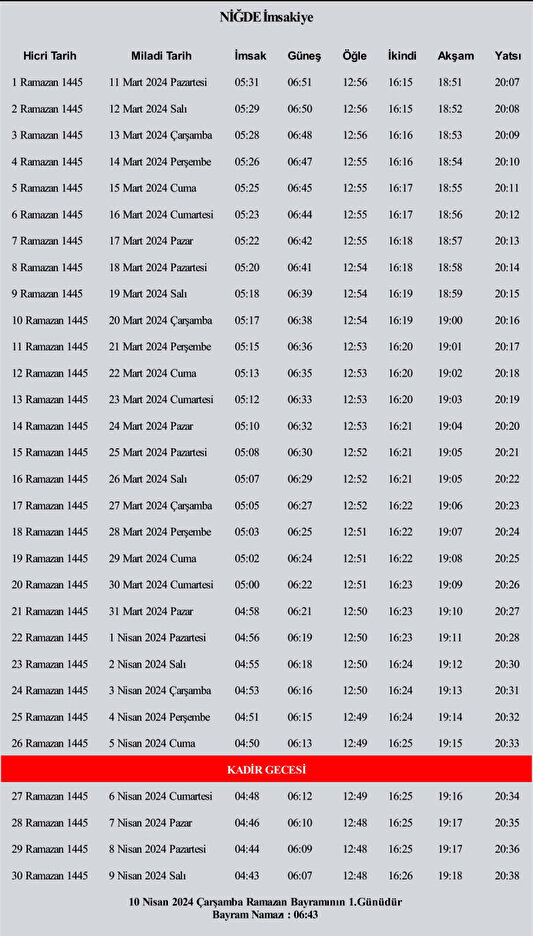 On bir ayın sultanı Ramazan-ı Şerif’in manevi iklimine girdik. 2024 Ramazan ayının birinci günü 11 Mart 2024 Pazartesi gününe denk geldi. İlk teravih 10 Mart akşamı yatsı namazıyla birlikte kılındı. O gece de ilk sahura kalkıldı. Diyanet 2024 Ramazan imsakiyesi yayımlanmasıyla birlikte Niğde İmsakiyesi 2024 belli oldu. İşte 2024 Niğde Ramazan imsakiyesi imsak, sahur, iftar, akşam ezan saati.