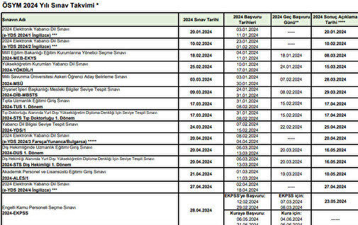 2024 yılında yapılacak sınavların takvimini içerir. Bu takvim, ÖSYM tarafından belirlenen önemli tarihleri içerir.