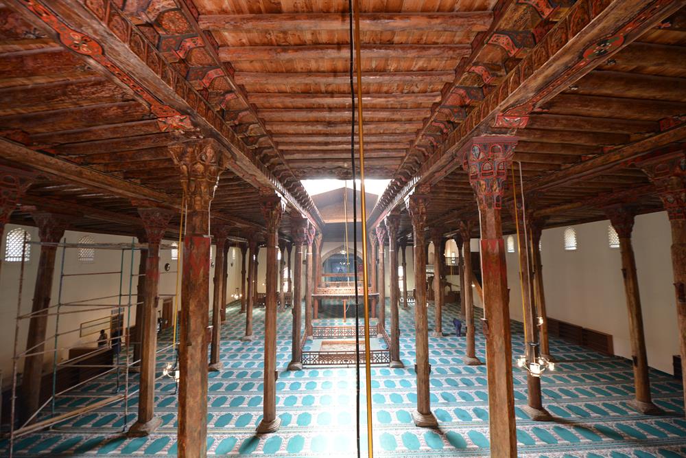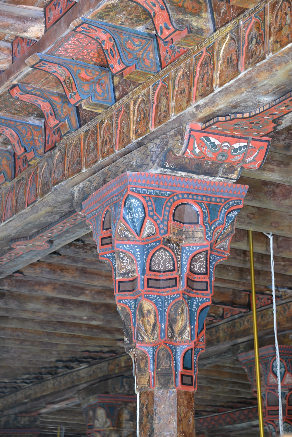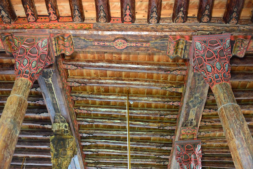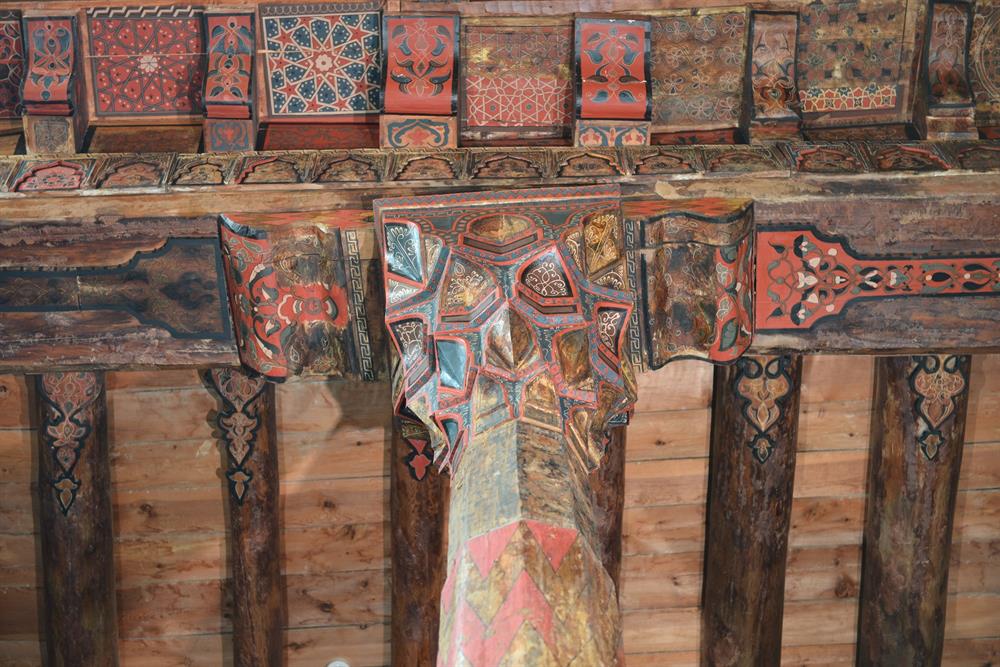 Ahşap süslemeler yoğun olarak sütun başlıklarında ve kirişlerde görülüyor.