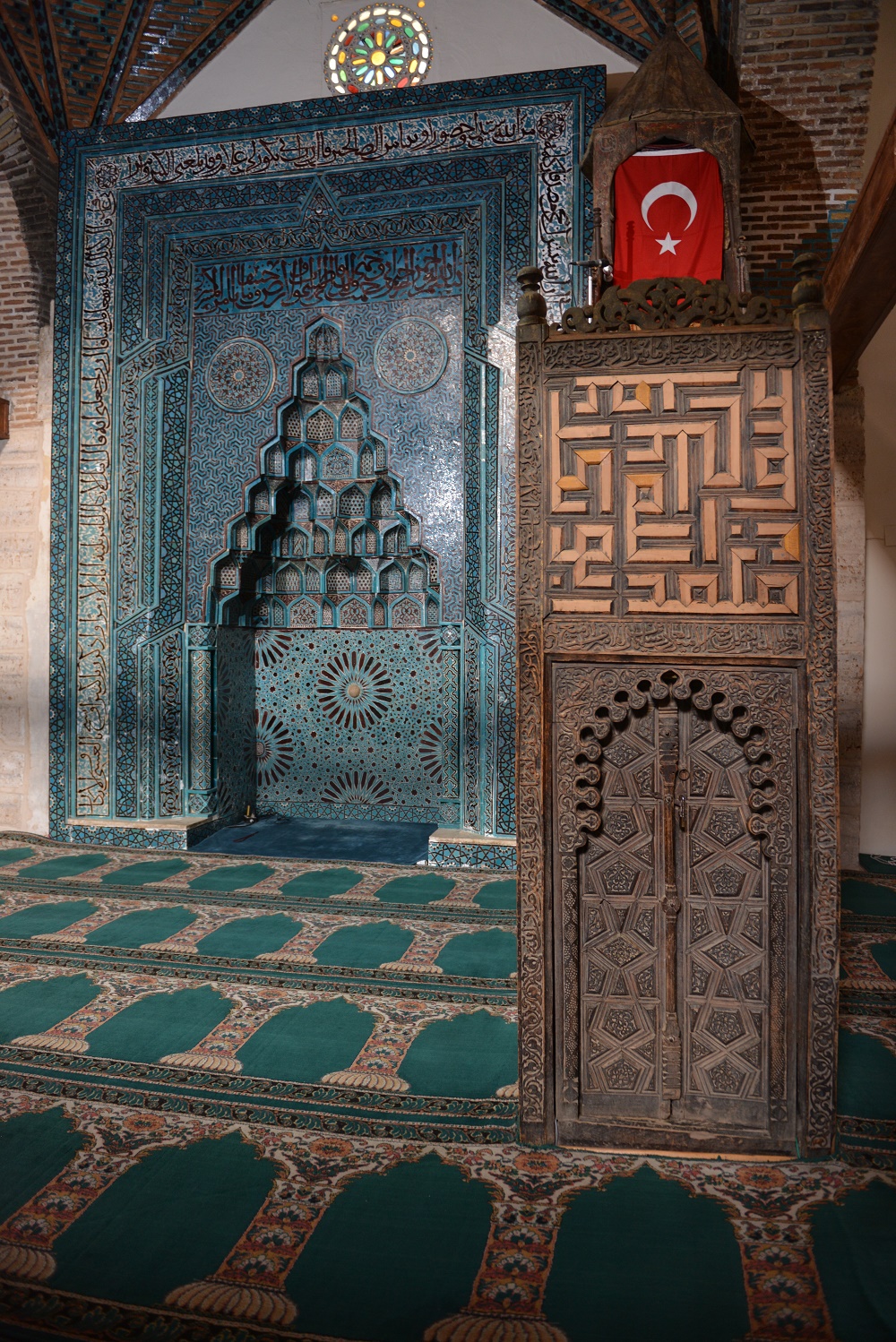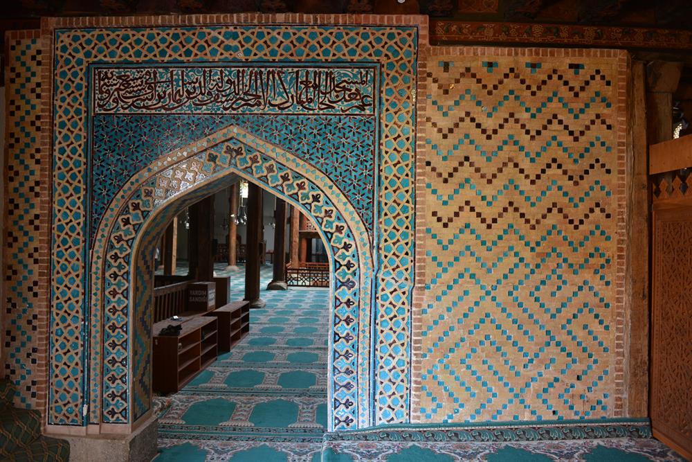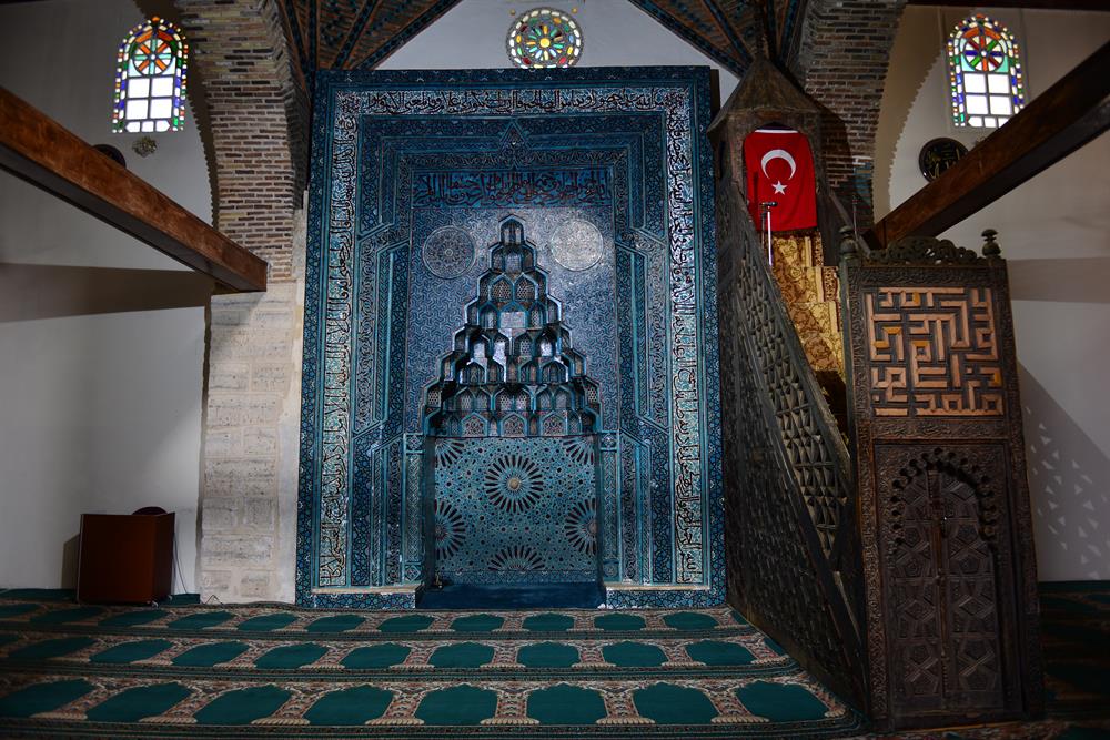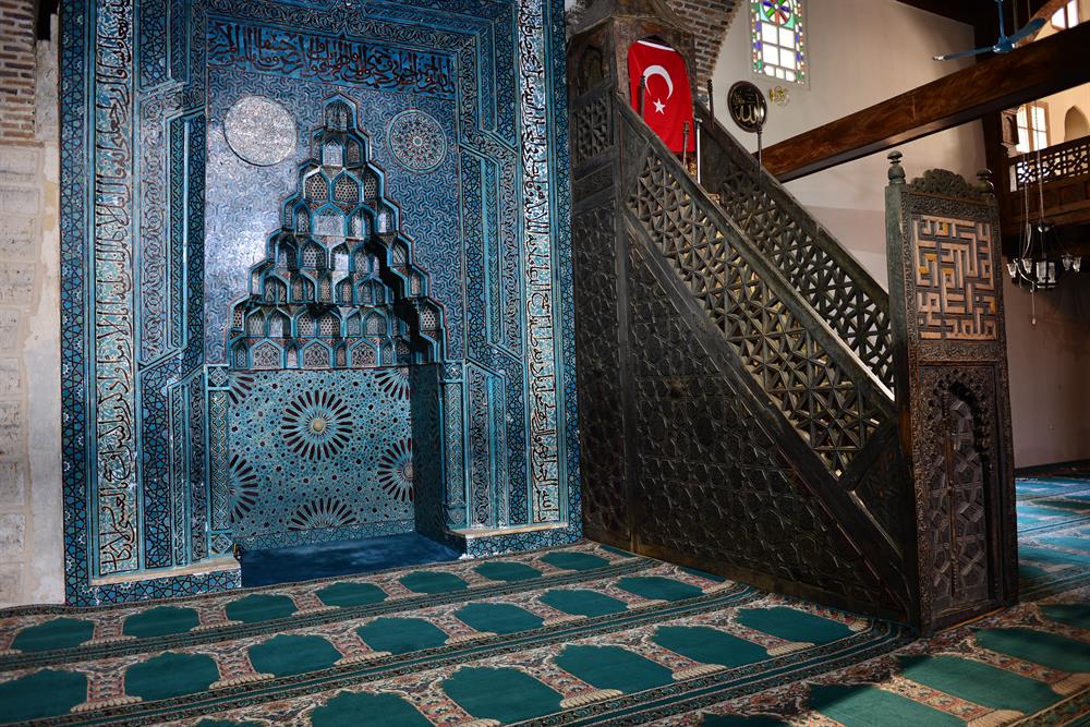 Beyşehir Eşrefoğlu Camii'nin çini mozaik bezeli mihrabı ve nefis oymalı ahşap minberi.