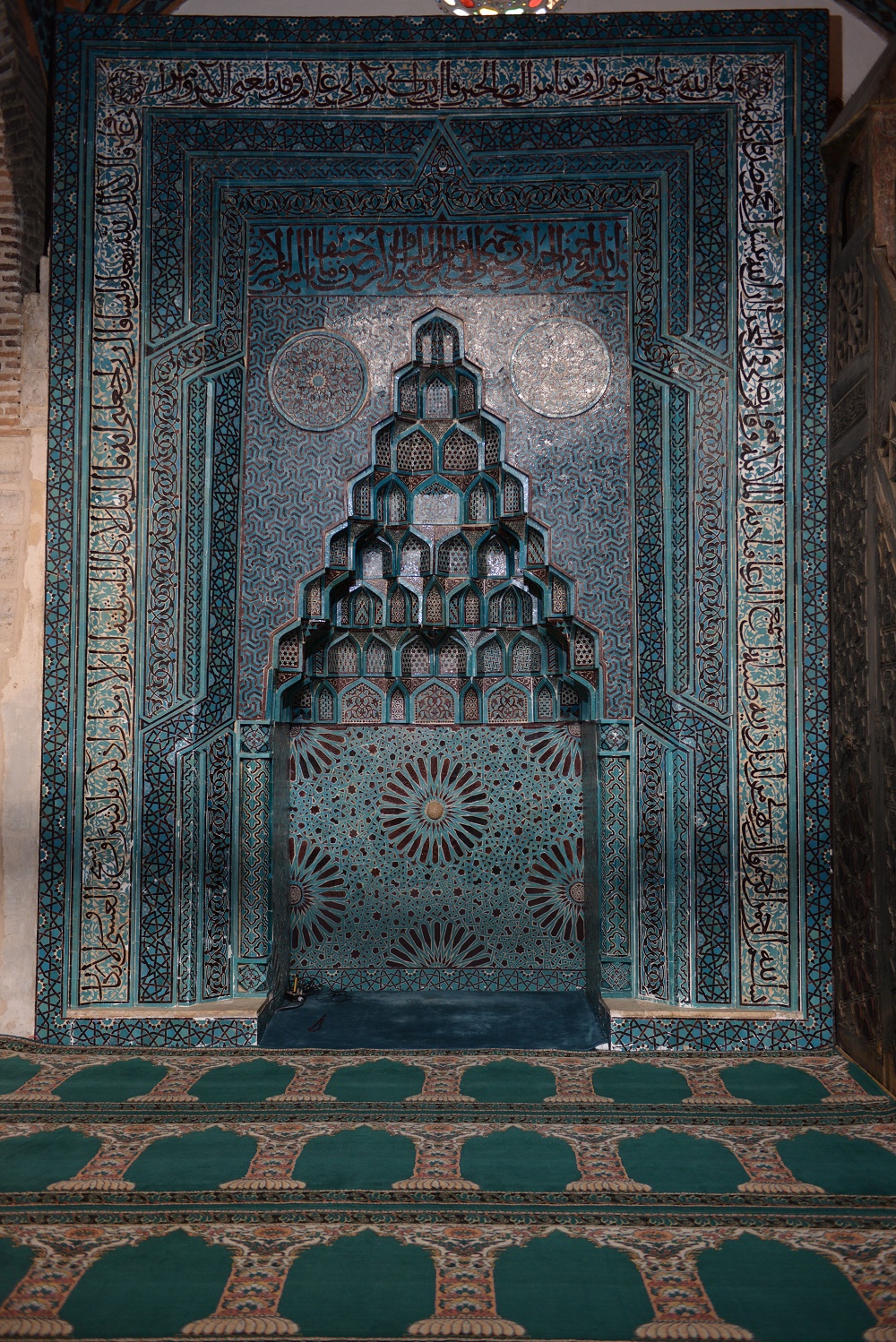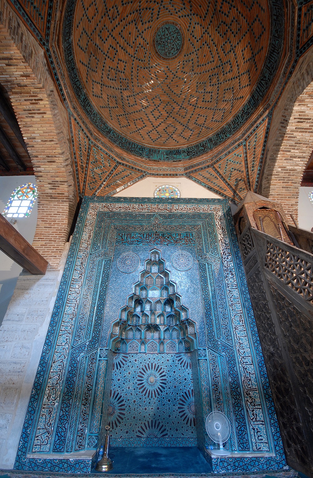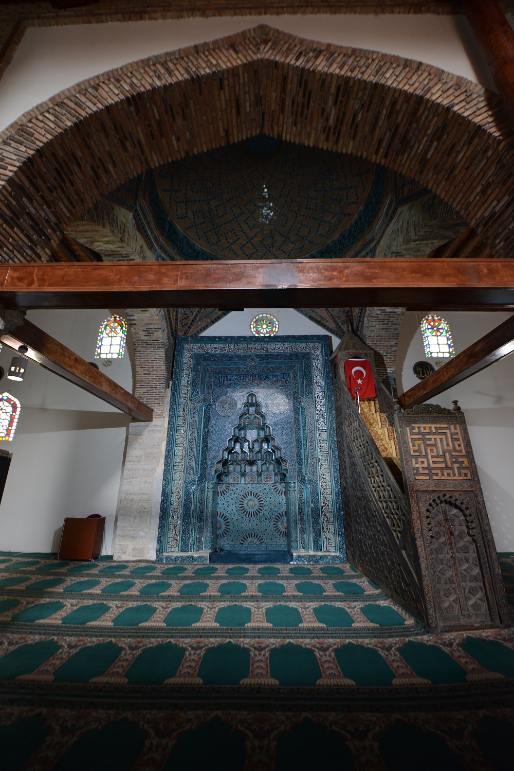 Beyşehir Eşrefoğlu Camii'nin çini mozaik bezeli mihrabı ve nefis oymalı ahşap minberi.