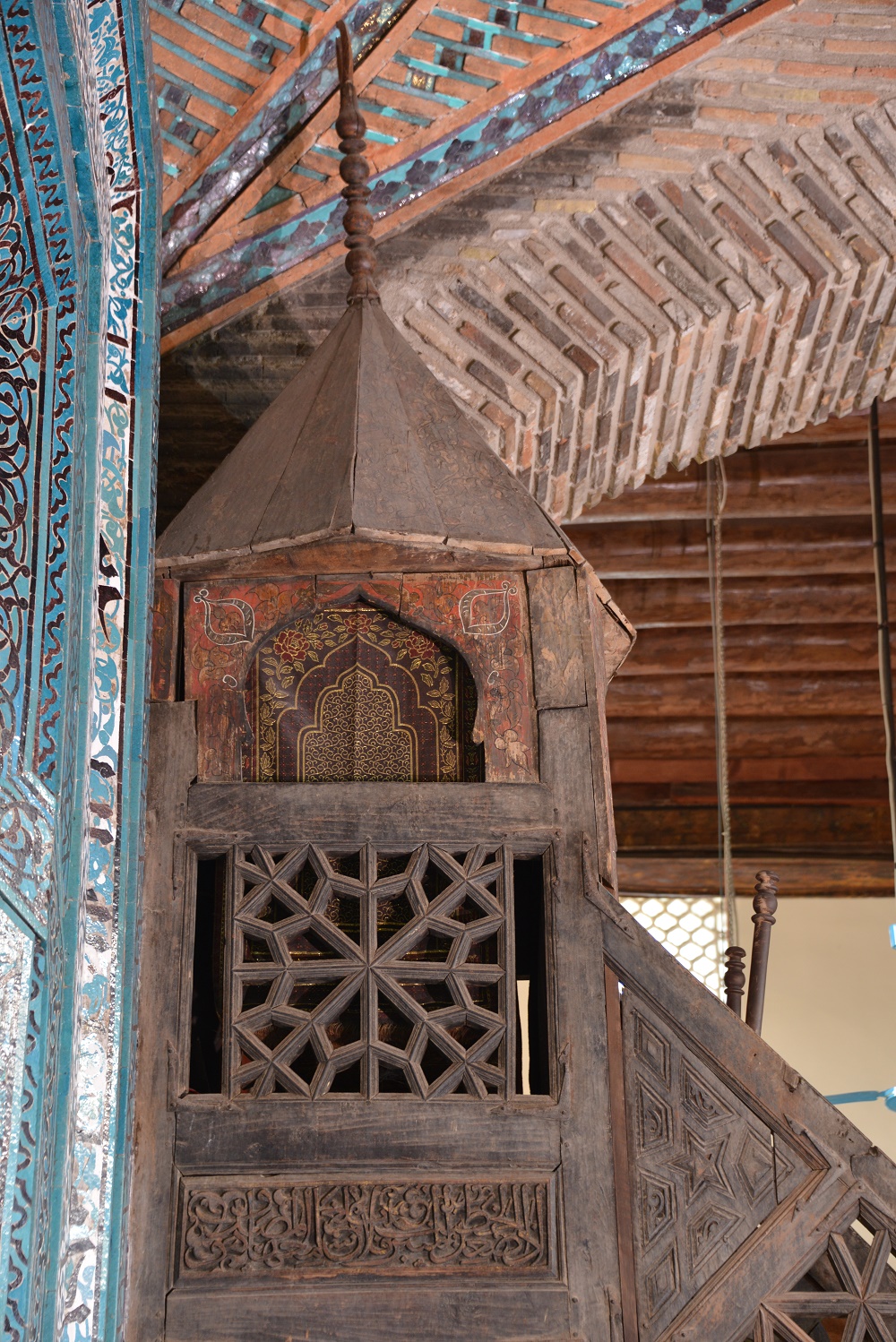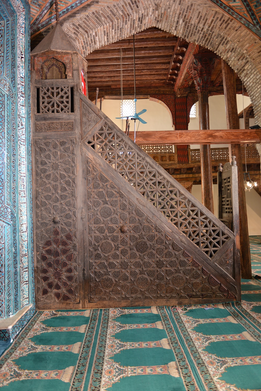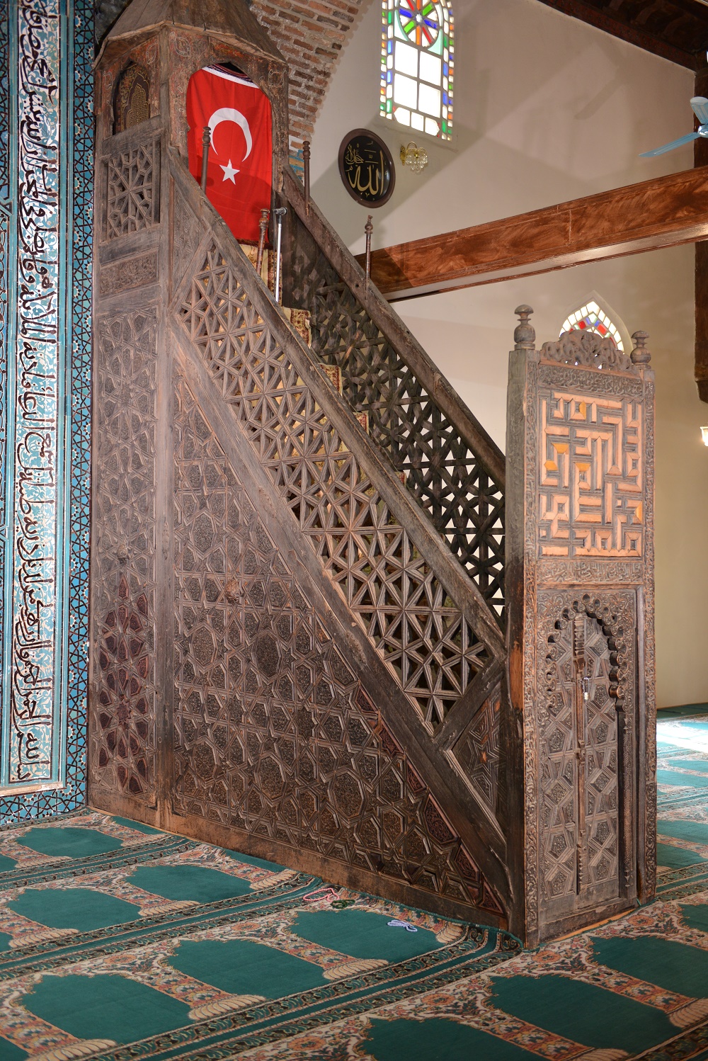 Ceviz ağacından oymalı, çatmalı ve tutkalsız olarak yapılan minber inanılmaz bir düzgünlük ve incelikte tasarlanarak, geometrik şekiller ve bitkisel bezemelerle dekore edilmiş.