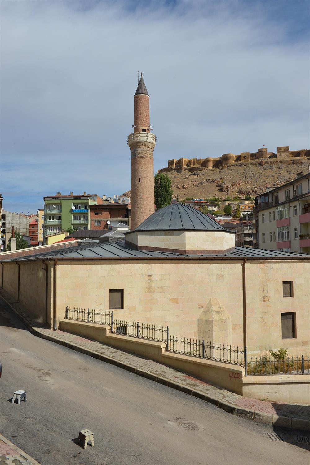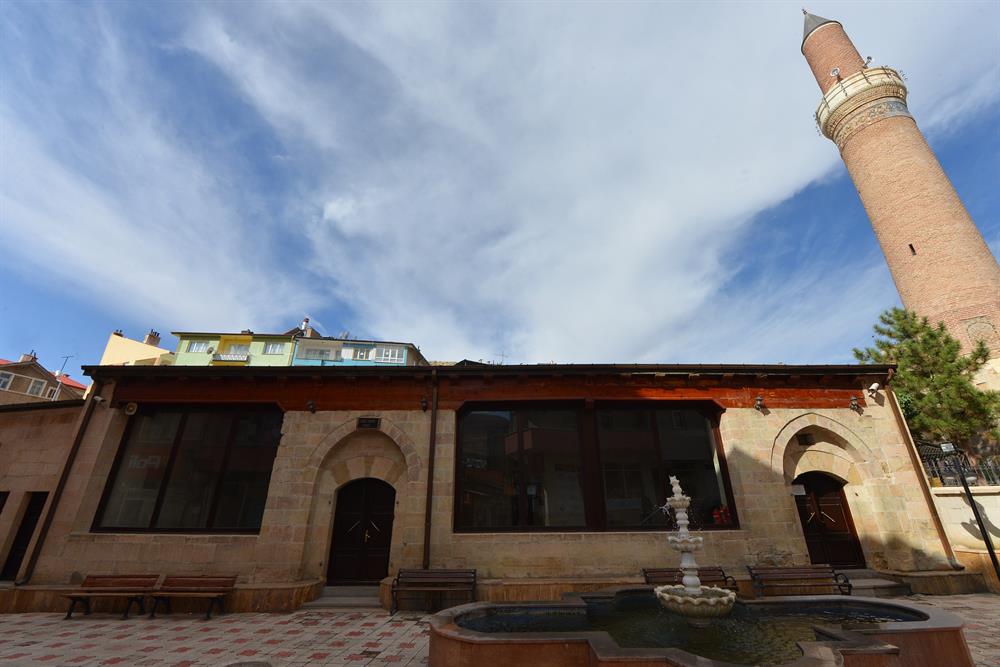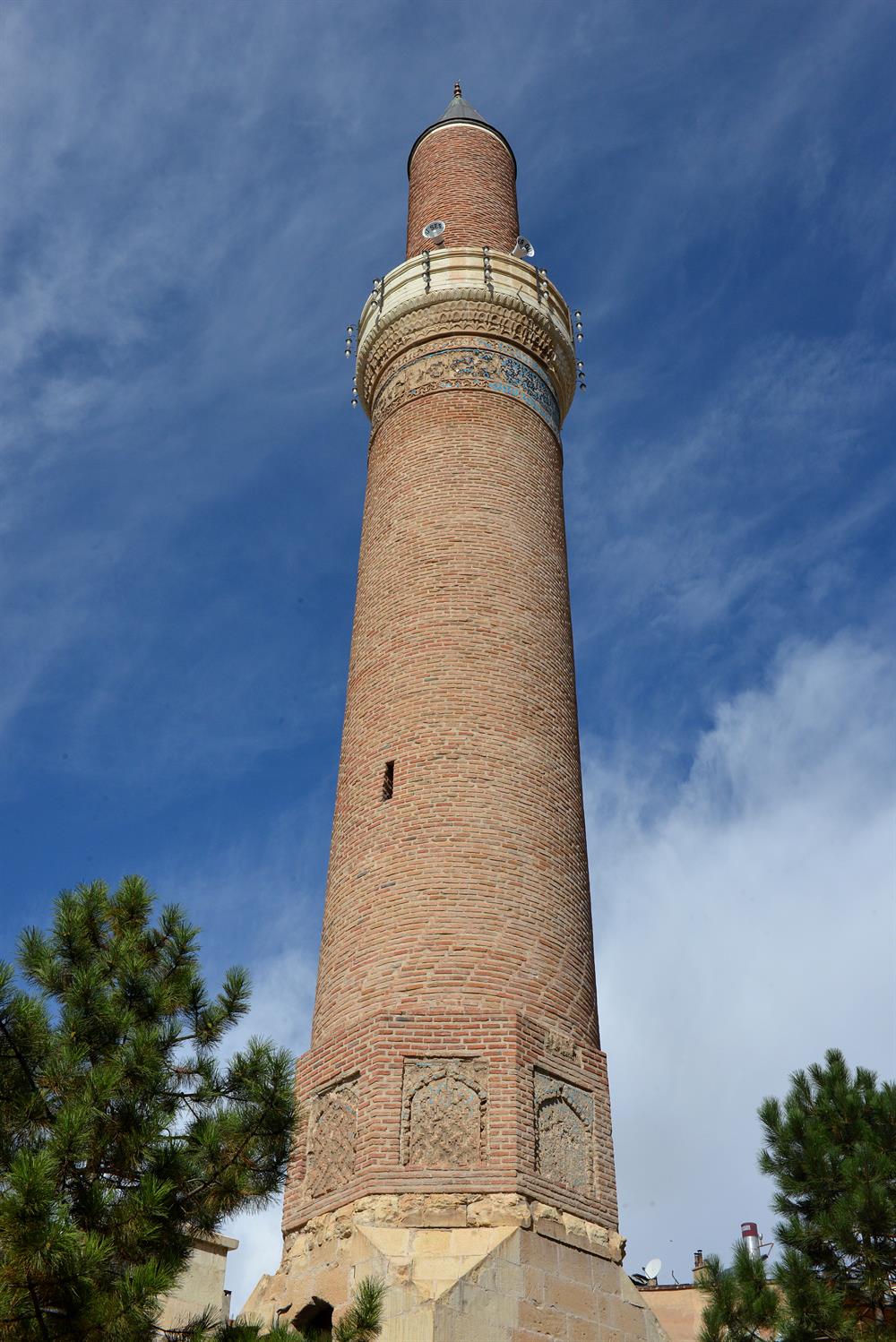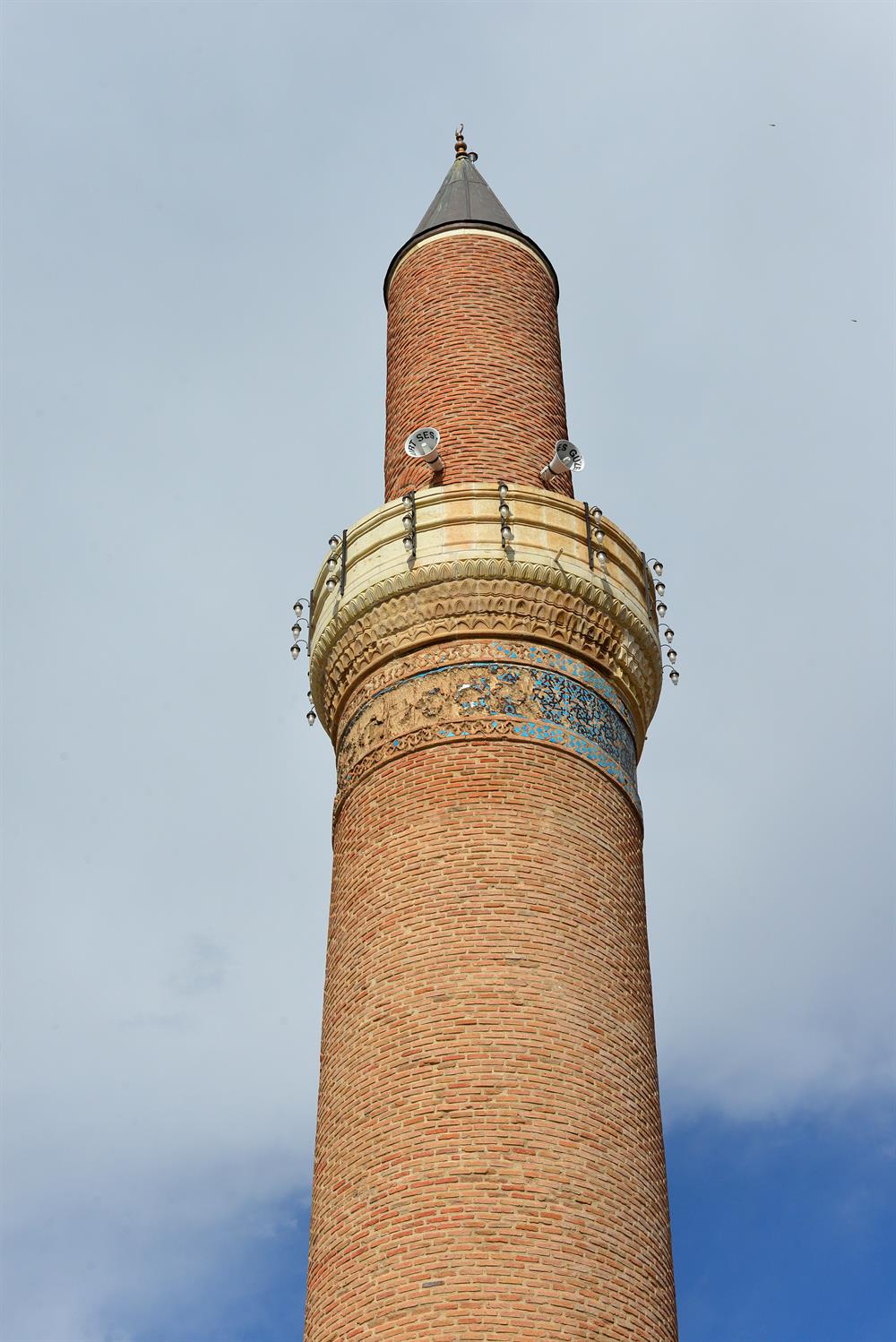 Anadolu Selçuklu geleneğindeki orijinal minaresi, kare kaide üzerine silindirik gövdeli olarak yükseliyor. Sekizgen papucunda ve şerefe altında geometrik ve bitkisel motifli çiniler bulunuyor.