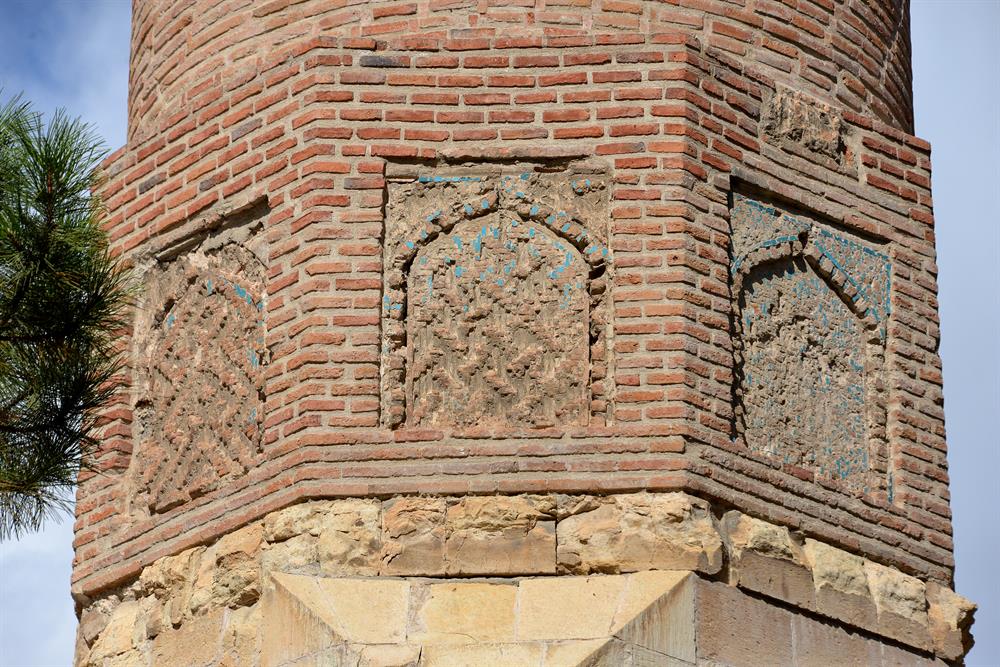 Minarenin papucundaki geometrik ve bitkisel motifli çinilerin büyük bölümü düşmüş.