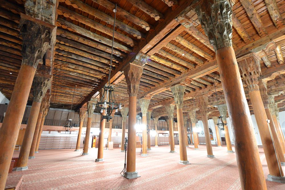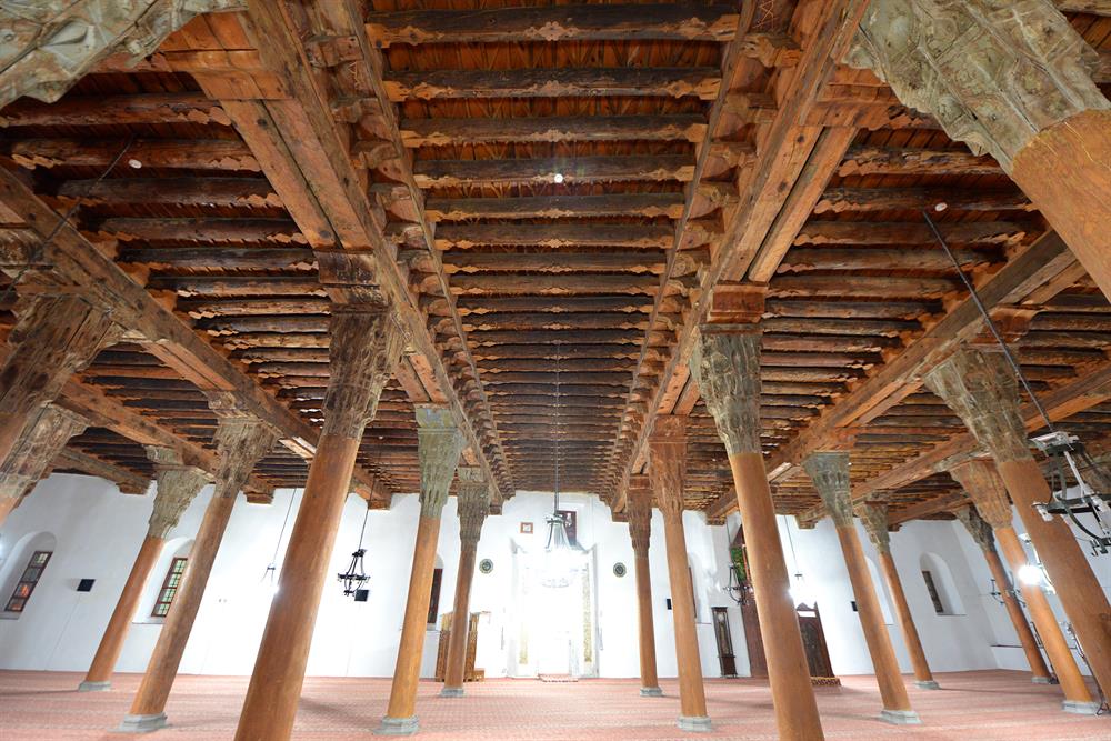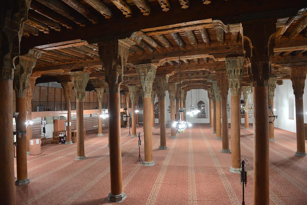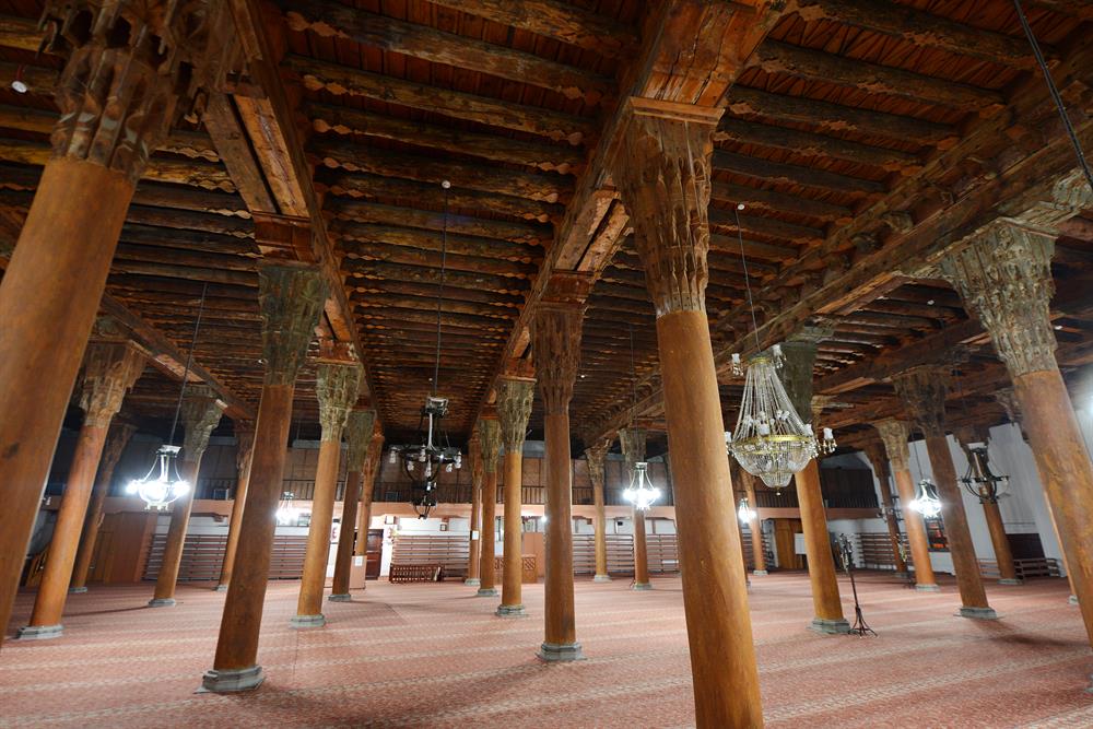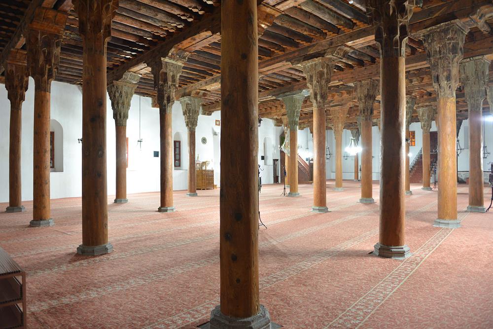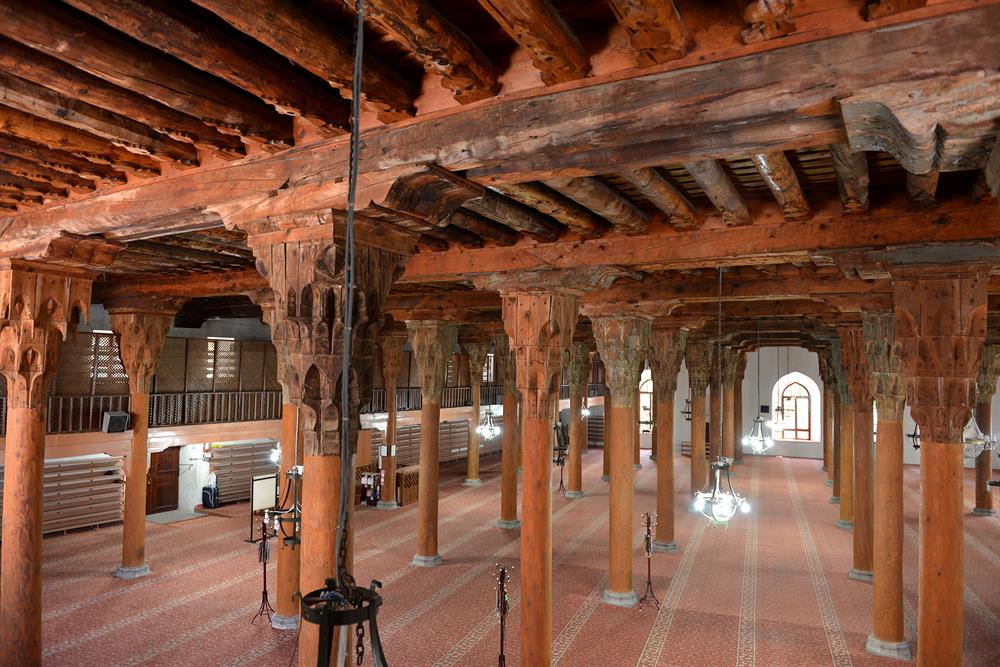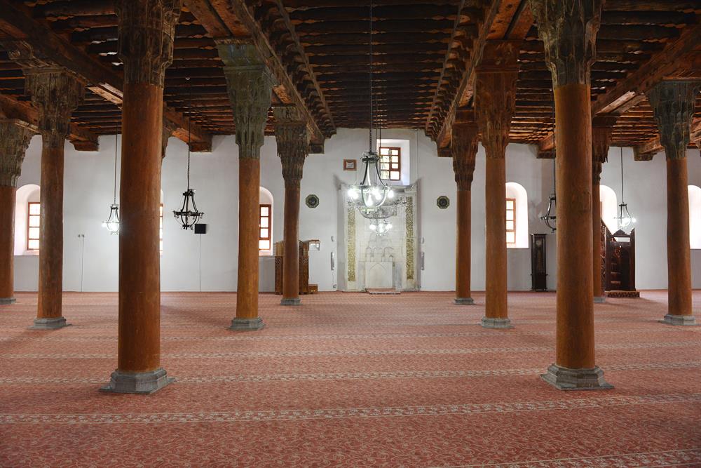 Harim, iri mukarnas başlıklı kırk ahşap direkle dokuz sahına bölünmüş.