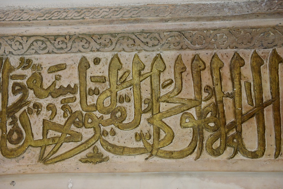 Taş mihrabı süsleyen yazı kuşağından detay.