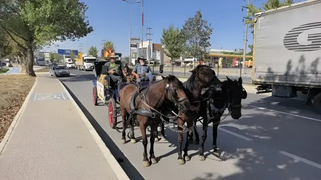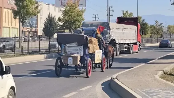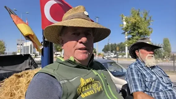 Двое немецких фермеров, проезжающих через район Инегьол в Бурсе, совершают путешествие на повозке из Берлина в Иерусалим, чтобы передать послание мира в честь 80-й годовщины окончания Второй мировой войны. Проезжая через 11 стран, фермеры преодолеют путь длиной 4 800 километров.