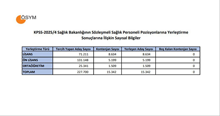 KPSS-2025/4: Sağlık Bakanlığının Sözleşmeli Sağlık Personeli Pozisyonlarına Yerleştirme Sonuçları Açıklandı. 02-08 Mayıs 2025 tarihleri arasında tercihleri alınan KPSS-2025/4 Sağlık Bakanlığının sözleşmeli sağlık personeli pozisyonlarına yerleştirme işlemleri tamamlanmıştır. Adaylar, yerleştirme sonuçlarına 14 Mayıs 2025 tarihinde saat 17.30'dan itibaren ÖSYM’nin https://sonuc.osym.gov.tr adresinden T.C. kimlik numaraları ve aday şifreleriyle erişebilecektir.