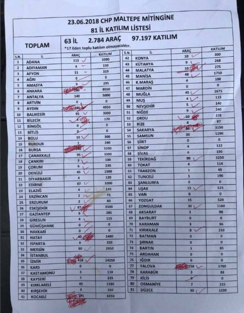 CHP'nin mitinge Ankara, İzmir, Bursa, Sakarya, Tekirdağ, Yalova, Edirne'nin de aralarında bulunduğu 63 ilden 97 bin 197 vatandaşın 2 bin 784 araçla getirildiği ortaya çıktı.