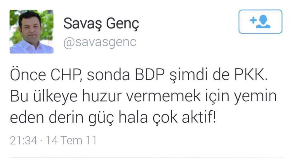 Gülen grubunun akademisyenlerinden Doç. Dr. Savaş Genç, 2011'deki paylaşımında ise yerini HDP'ye bırakan BDP için "Bu ülkeye huzur vermemek için yemin eden derin güç" demişti.