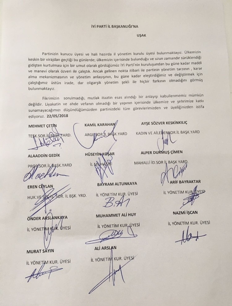 İYİ Parti Uşak İl Yönetim Kurulu üyesi 17 kişi ile merkez ilçe yönetim kurulu üyesi 4 kişi partilerinden istifa etti.