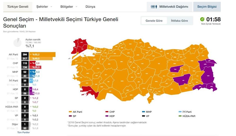 24 Haziran seçim sonuçları resmi olmayan verilerine göre Cumhurbaşkanı Erdoğan ilk turda seçilerek yeni dönemin ilk Cumhurbaşkanı oldu. Cumhur İttifakı da yüzde 53,6 ile Meclis çoğunluğunu elde etti.