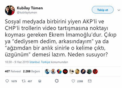 - İmamoğlu’nun “İt değil ‘basit’ dedim sözlerinin ardından FOX’tan ikinci bir açıklama geldi. Kanalın haber müdür Kubilay Tümen İmamoğlu’nu sosyal medyadan örtülü olarak yalanladı: “Sosyal medyada birbirini yiyen AKP’li ve CHP’li trollerin video tartışmasına noktayı koyması gereken Ekrem İmamoğlu’dur. Çıkıp ya “dediysem dedim, arkasındayım” ya da “ağzımdan bir anlık sinirle o kelime çıktı, üzgünüm” demesi lazım. Neden susuyor?”